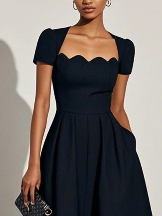 Black Irregular Craftsmanship Classic Square Neck Short Sleeve A-Line Midi Dress