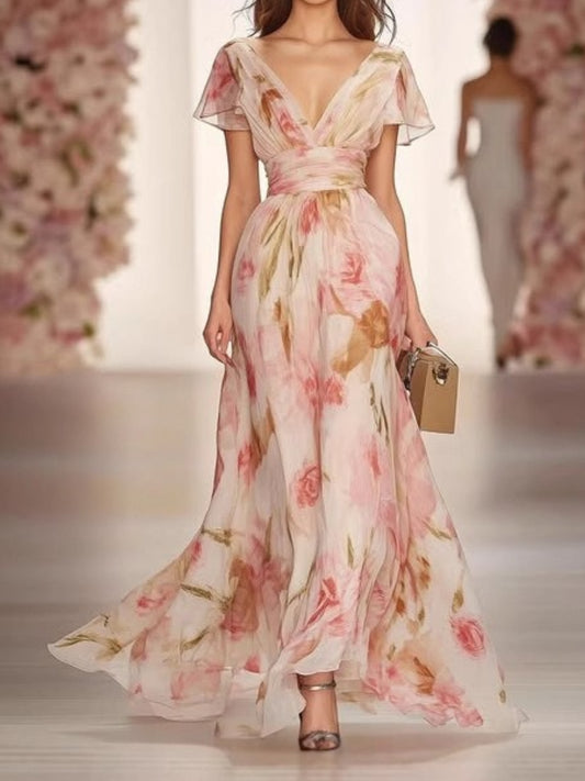 Pink Floral V Neck Short Sleeve Maxi Dress