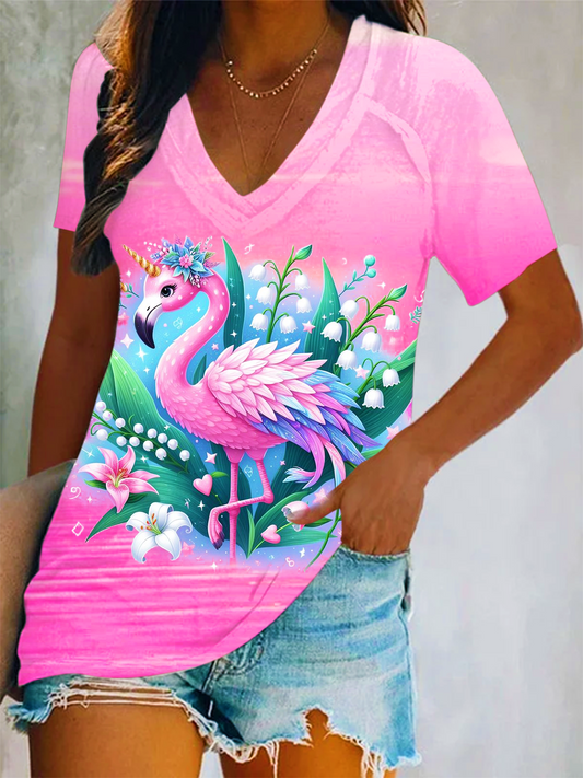 Gradient Summer Vibes Unicorn Flamingo Art Short Sleeve V Neck Print Top