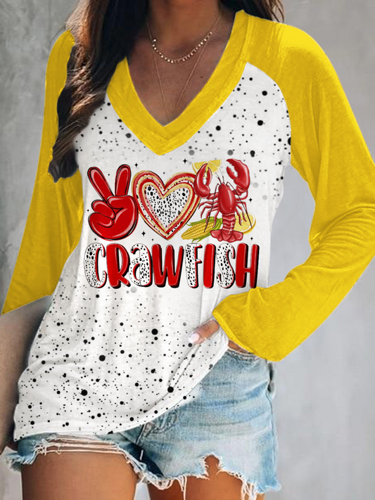 Peace Love Crawfish Print V-Neck Long Sleeve Top