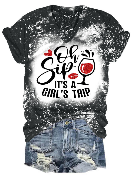 Oh Sip It's A Girl's Trip Print V-neck T-shirt