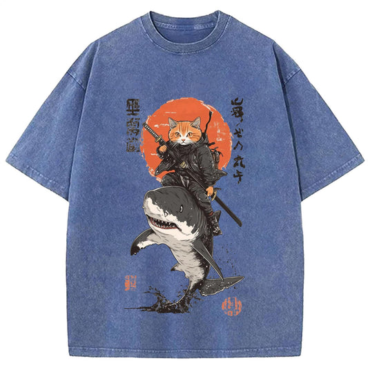 Japanese Frog Samurai Round Neck Washed T-Shirt