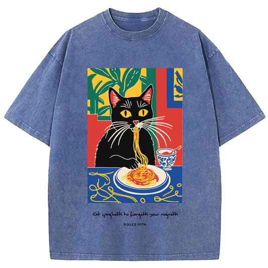 Black Cat Eating Ramen Washed Crew Neck T-Shirt