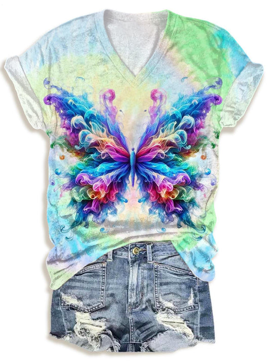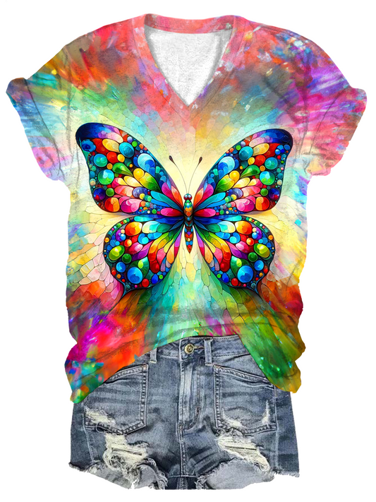 春のカラフルグラデーションバタフライプリントVネックTシャツ