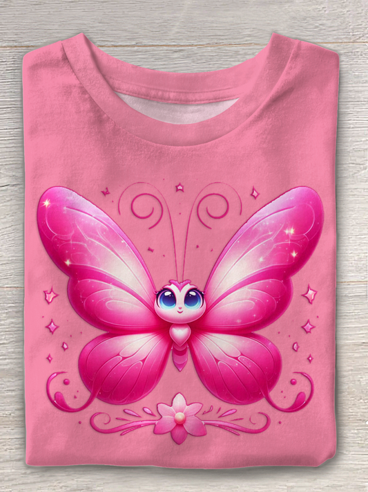 かわいい漫画の蝶のプリントクルーネックTシャツ