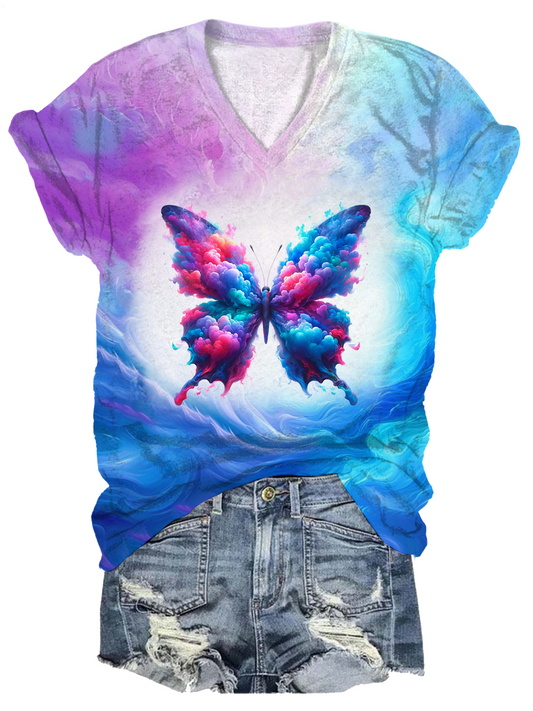キュートなカラフルな蝶プリントのVネックTシャツ