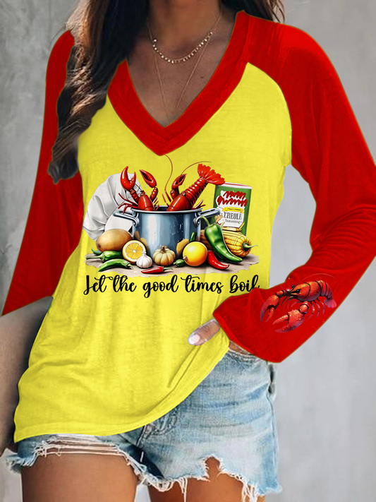 • 크래피쉬 렛 더 굿 타임스 보일 프린트 V넥 롱슬리브 탑