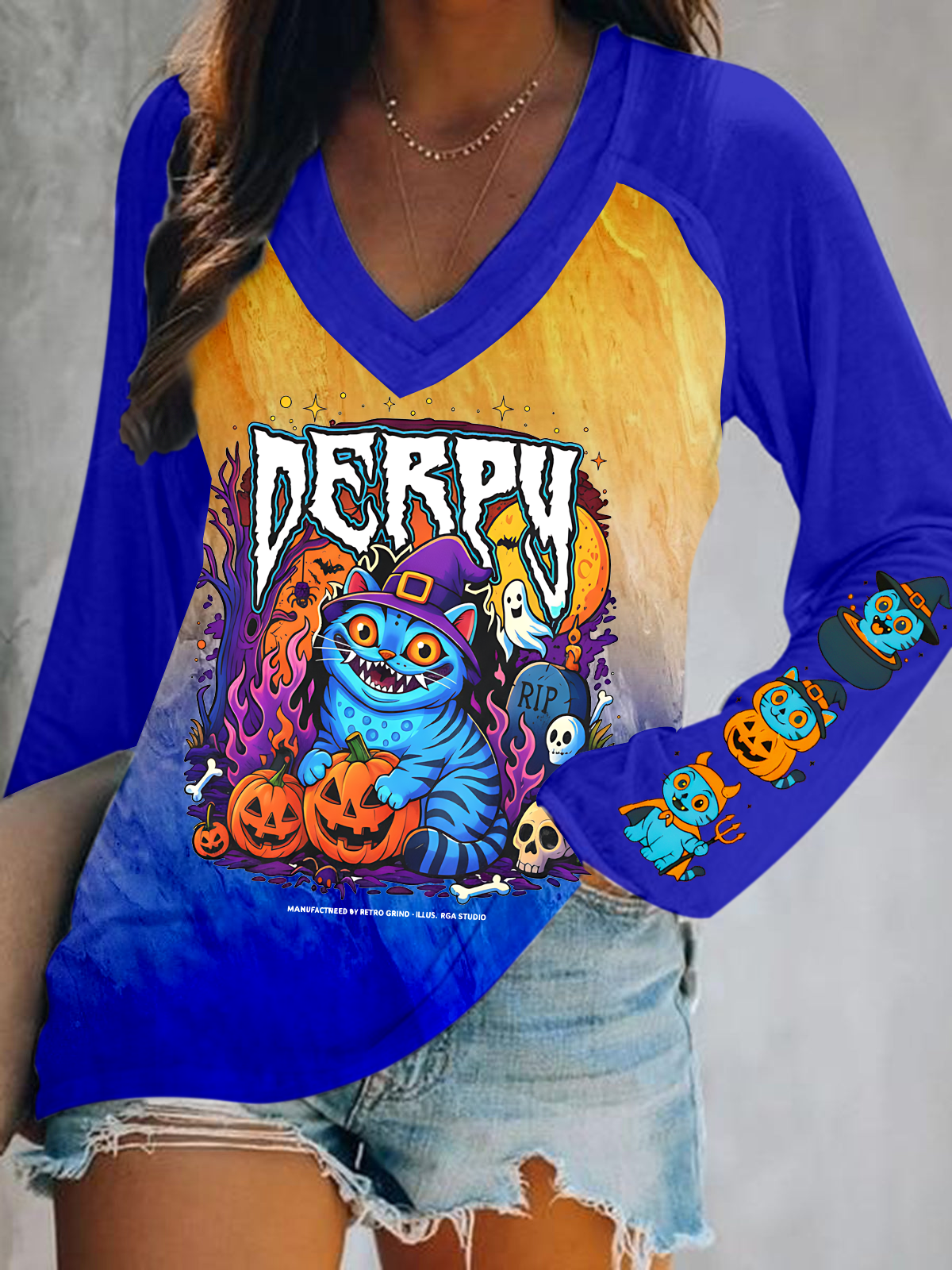 Vintage Halloween Derpy Kpop Demon Hunters Print V-Neck Long Sleeve Top